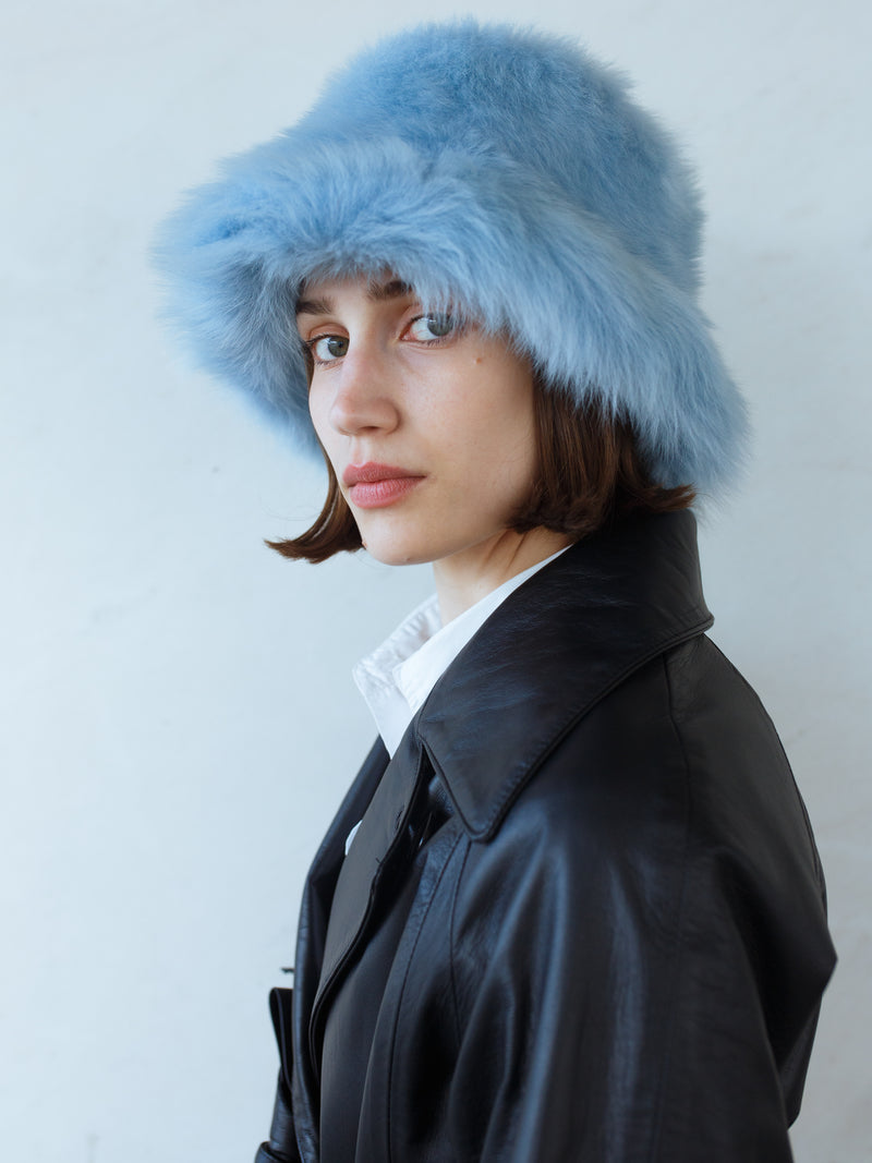 Our iconic Eila Hat in Lullaby Blue ecological toscana shearling is designed in a '90s-inspired bucket silhouette with a cotton lining. Named after the grandmother of the designer who was a true bucket hat lover, Eila is the cherry of your wardrobe essentials.