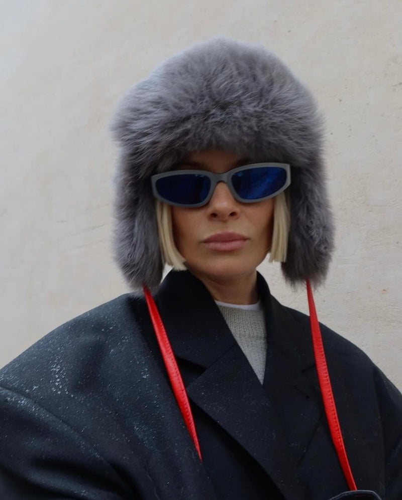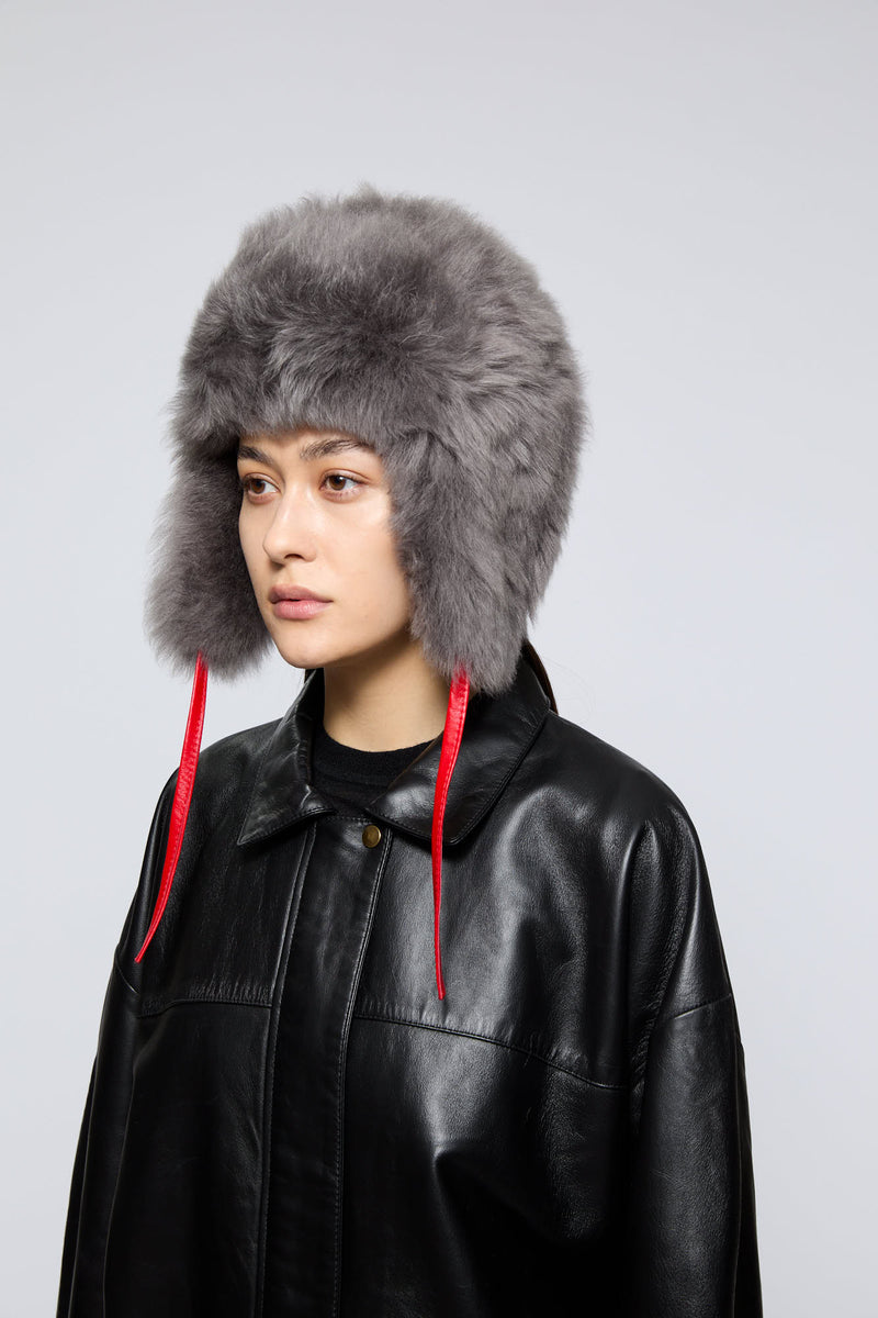 Size GuideA fluffy Toscana shearling hat with red nappa leather straps. Wear your hair in loose tousled waves to complete the look.
