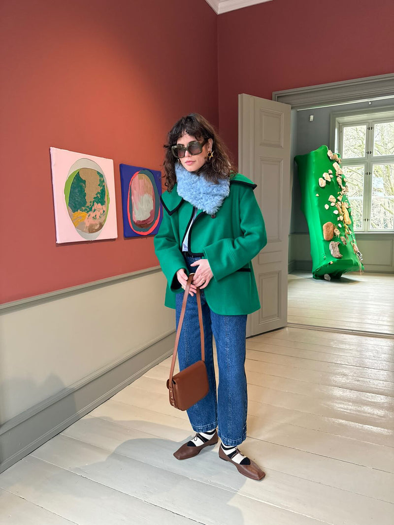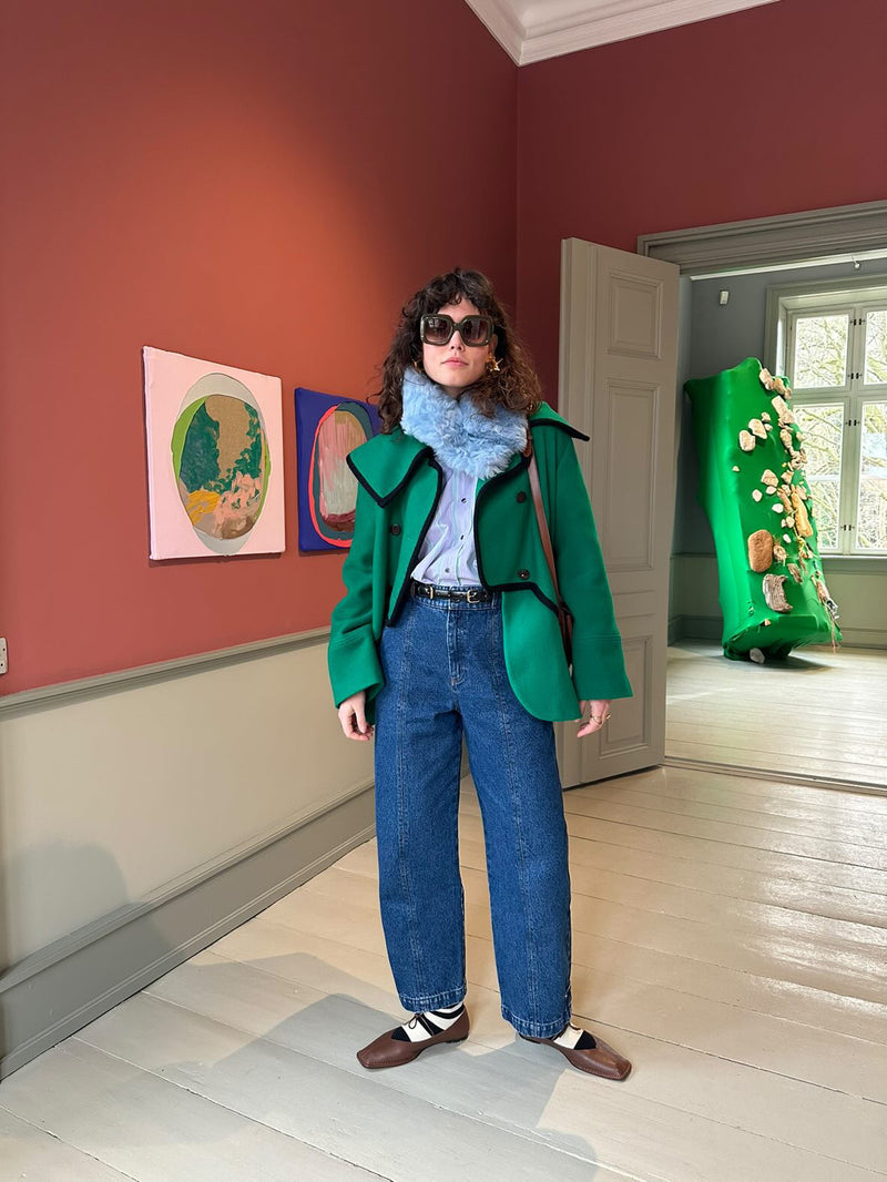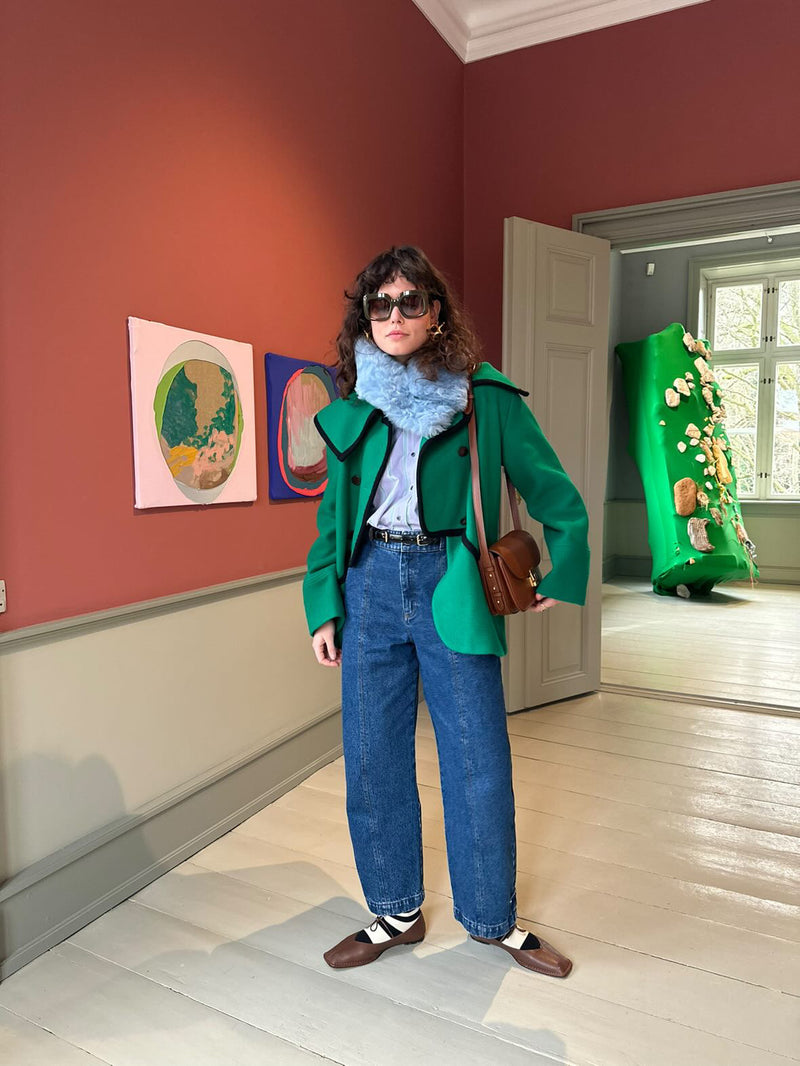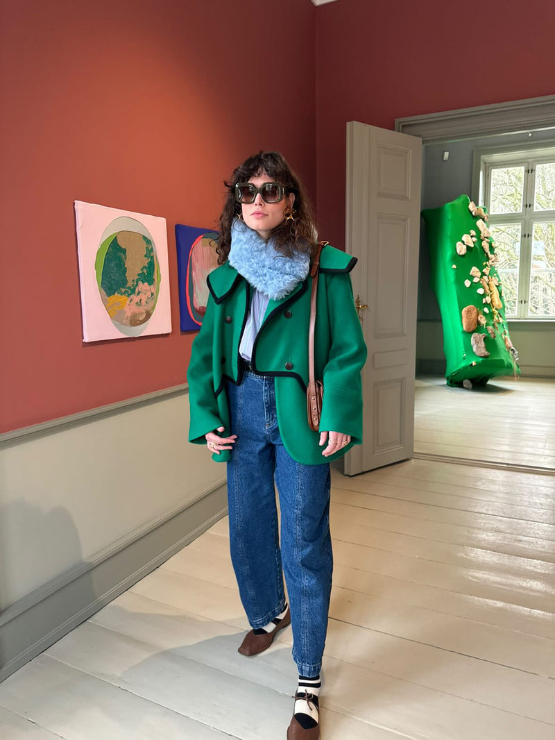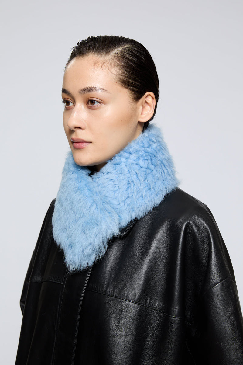 A heavenly soft, curly tigrado shearling collar in Lullaby Blue. It can be buttoned in two different ways. The buttons are hidden and the collar is 75 cm long and 11 cm wide. A true accessory hero.