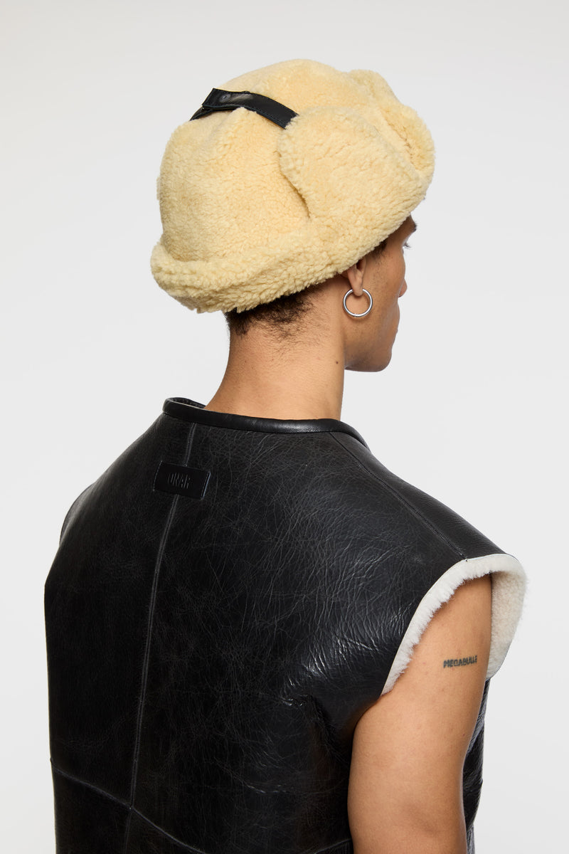 The Aslak Hat, offers both luxurious warmth and distinctive style. Expertly handcrafted in Greece, this contemporary trapper-style hat is made from sumptuously soft ecological UK shearling, providing unparalleled comfort and insulation. Designed for cooler temperatures, it features long ear flaps that can be worn down for maximum warmth or secured overhead with adjustable leather ties for a versatile look. The Aslak Hat is an effortlessly chic piece, perfect for elevating any cold-weather ensemble with a touch of modern luxury.