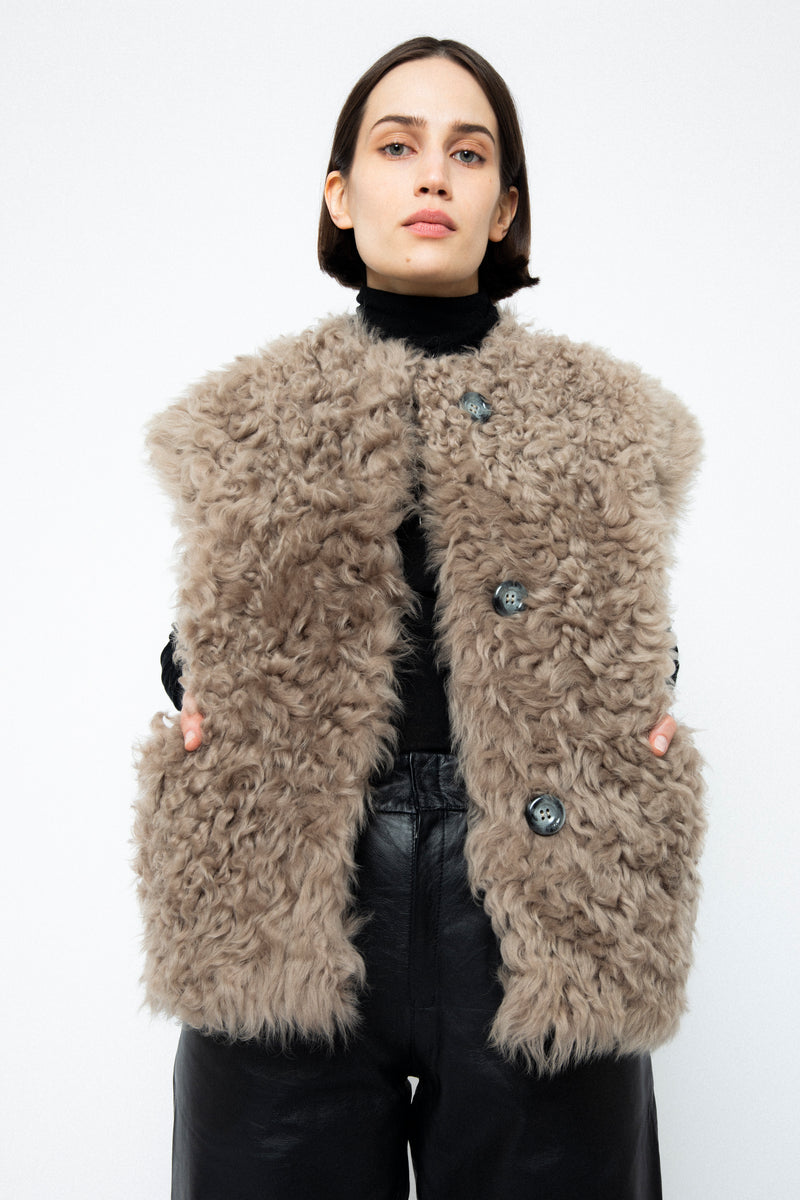 Eva vest is expertly made from plush chestnut shearling that is lined with textile. Curly shearling nods to the seventies, but in a strictly minimalist form. Pockets on the front. Eva will make a stunning addition to your everyday wardrobe rotation. Layer it over a sweater or even a light jacket.