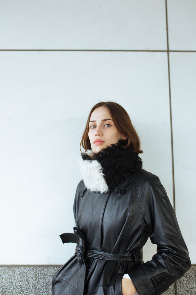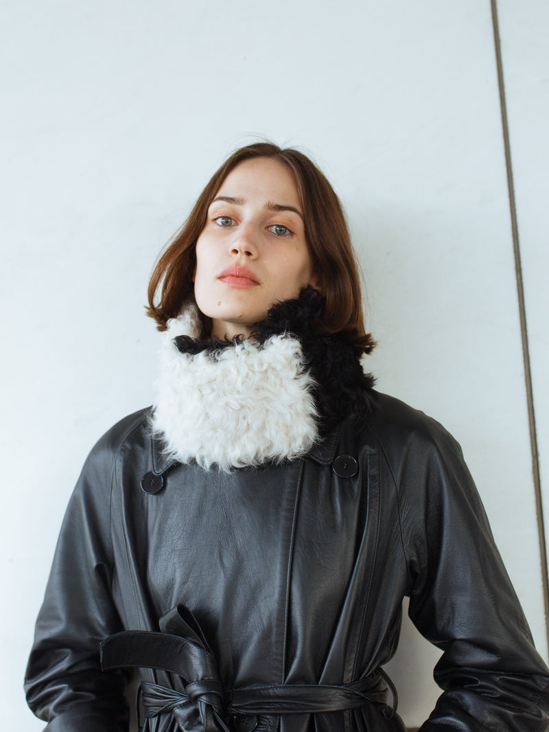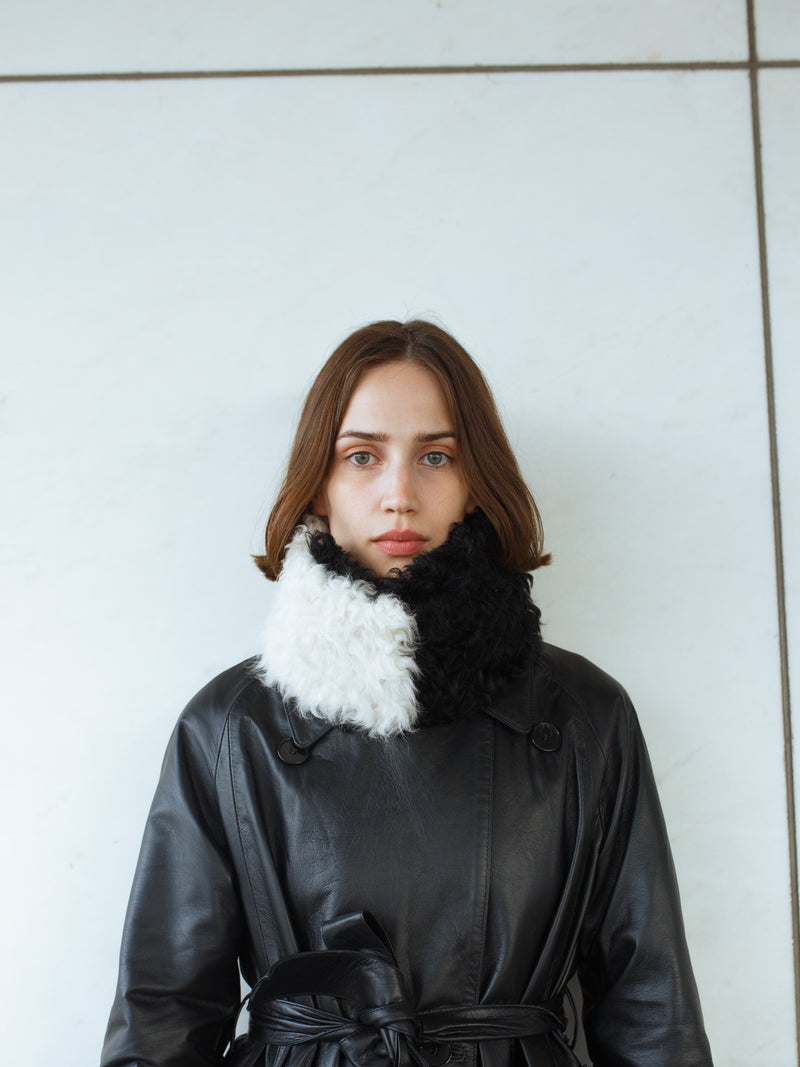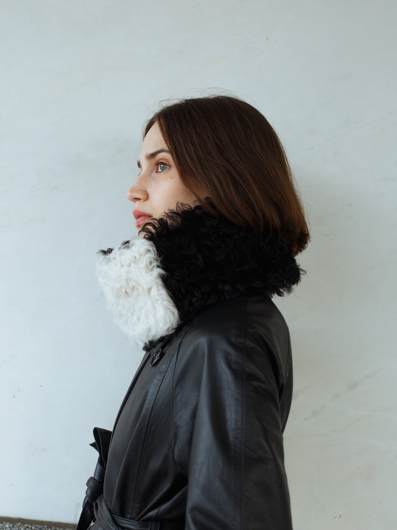 A heavenly soft, curly tigrado shearling collar in Black & Ivory. It can be buttoned in two different ways. The buttons are hidden and the collar is 75 cm long and 11 cm wide. A true accessory hero.