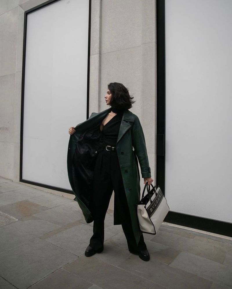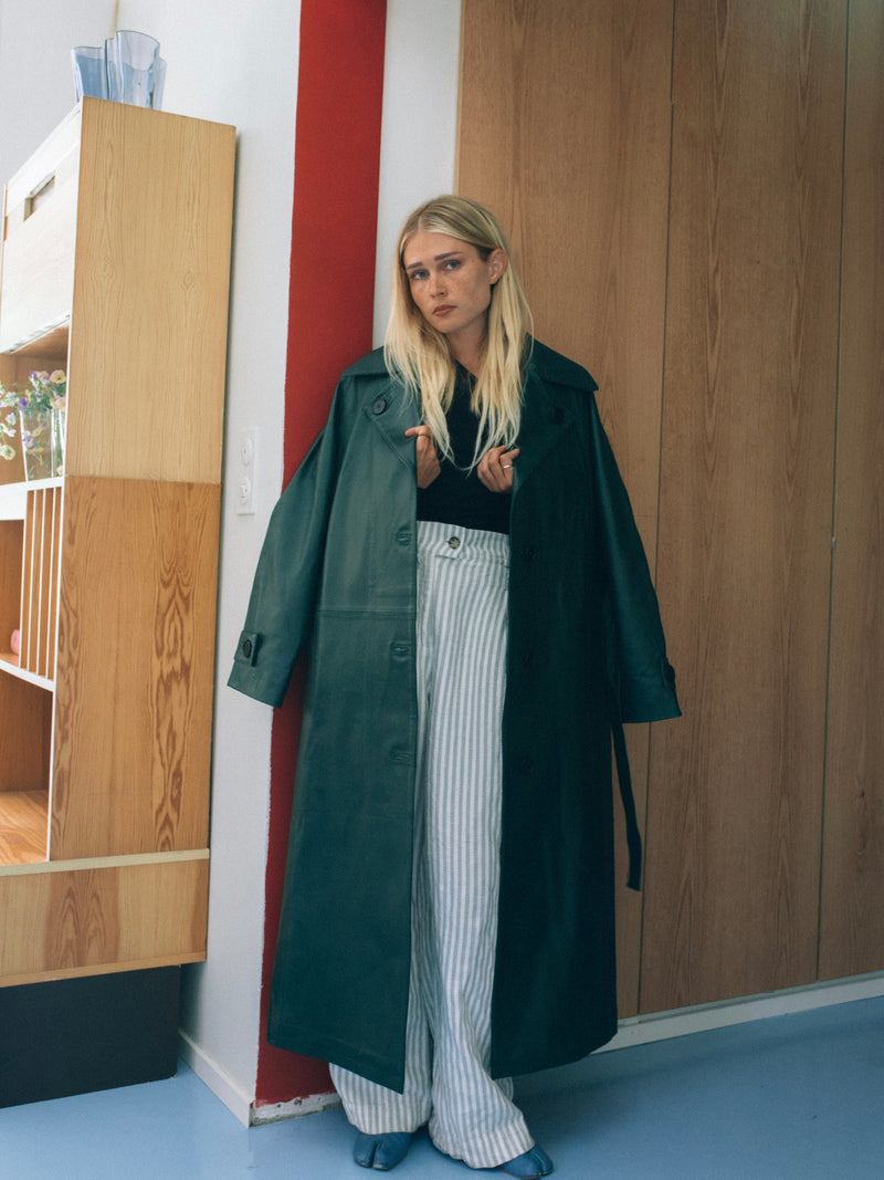 The softest power coat Marlene is perfect for wearing with different outfits throughout the year, shaped with a single-breasted fit with a self-tie belt to cinch in the waist to create an elegant silhouette. Our handmade trench coat is water repellent lamb nappa leather that lasts and gets better by time. Marlene has side pockets and a slit on the back side.