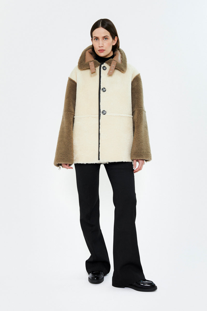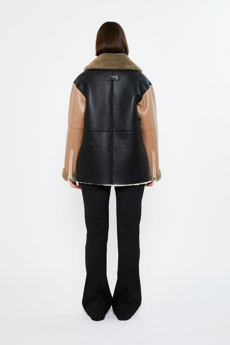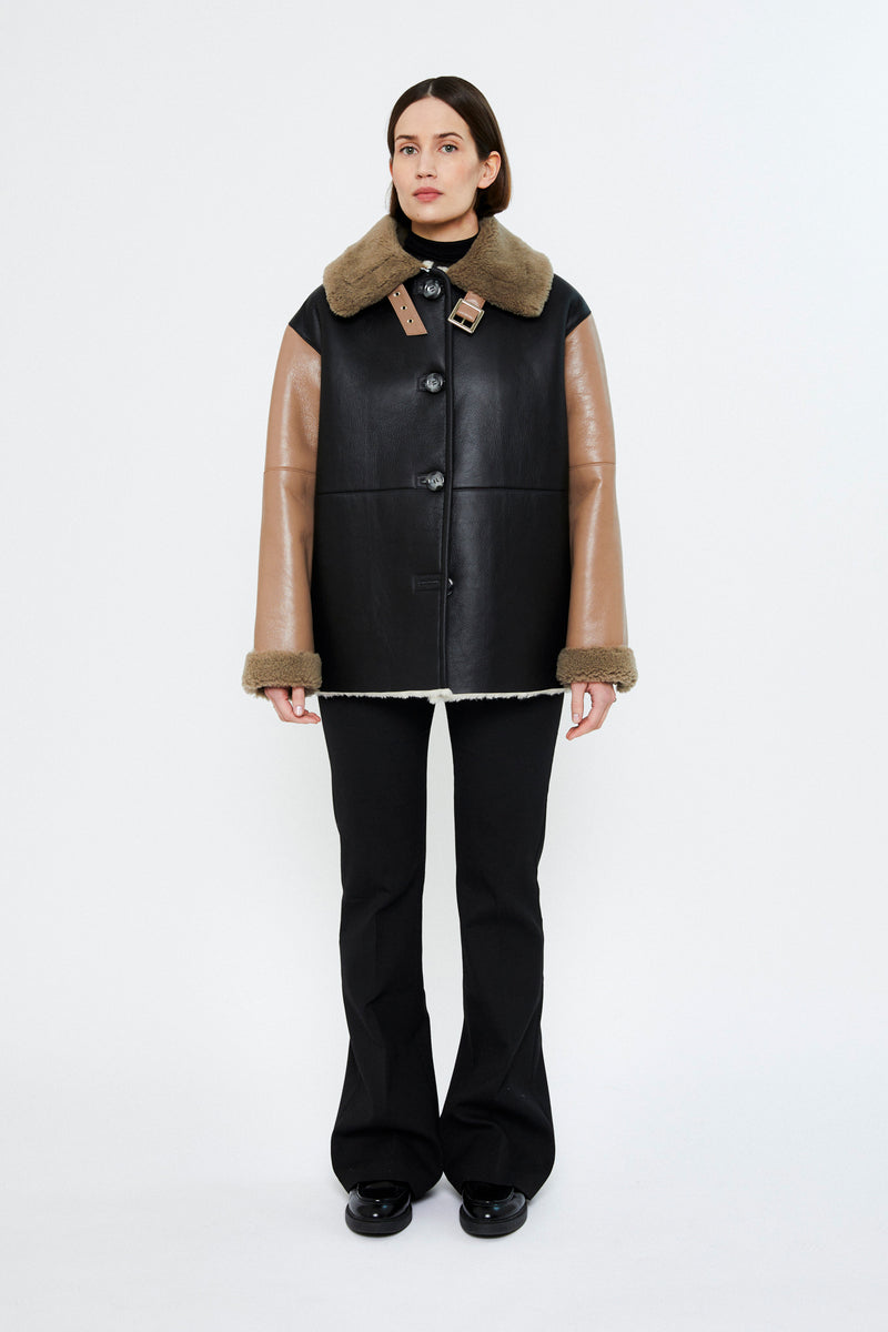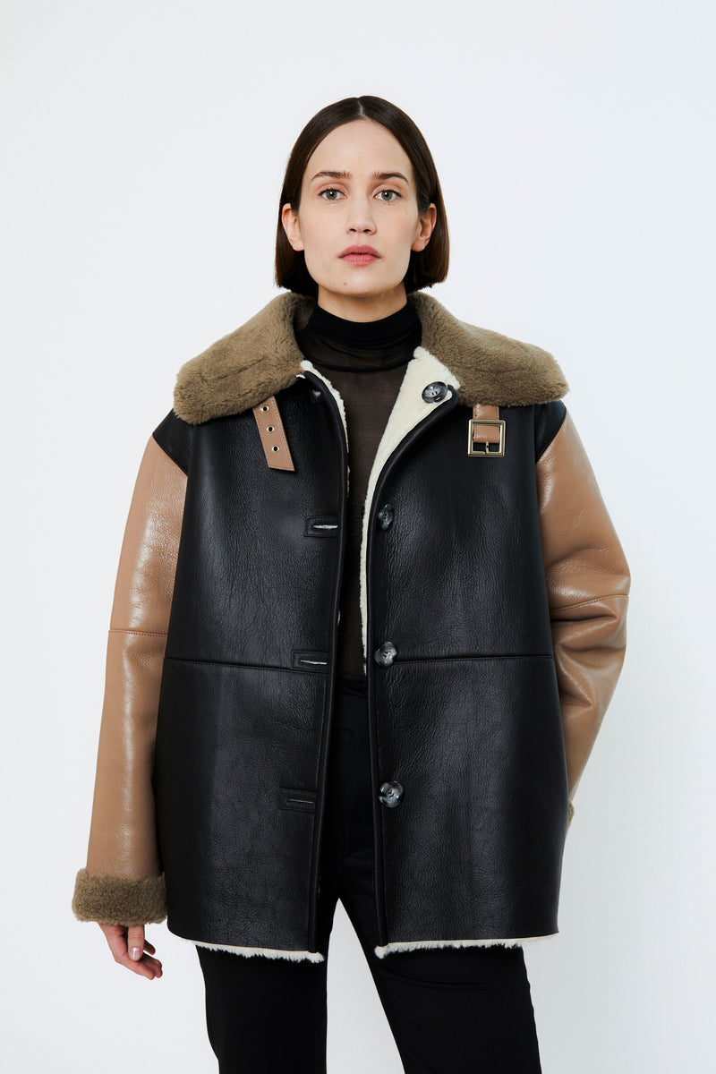Naoko is a reversible aviator jacket offering two styles in one, combining a sleek leather exterior with soft shearling on the reverse. Designed in a slightly oversized fit, it features button fastening, a buckled collar, side seam pockets, and zip-detailed sleeves. A versatile piece that becomes more beautiful with time and wear.