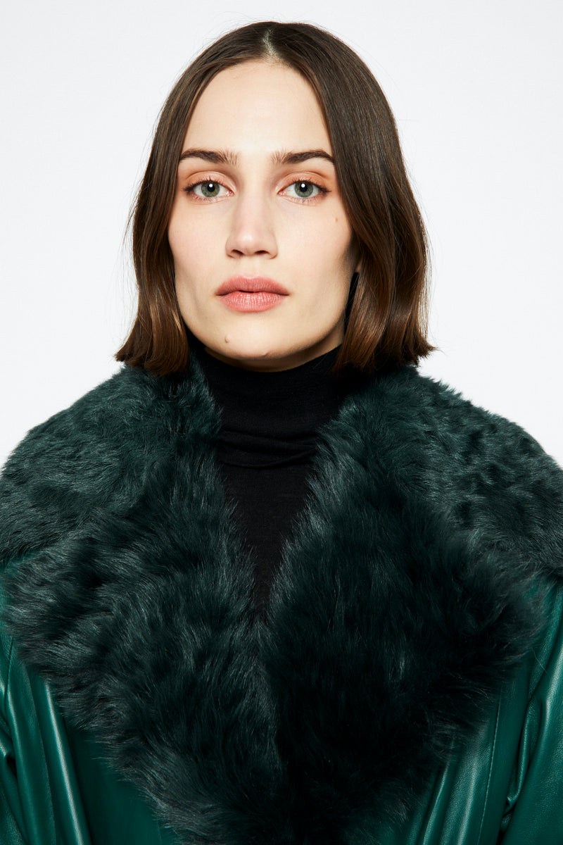 Wear it in two ways: it has an alternative button on the upper collar for a firm and warm fastening. Selen coat has a playful shearling collar, side pockets, and a slit on the backside. The coat is water-resistant and fully lined with a smooth viscose lining.