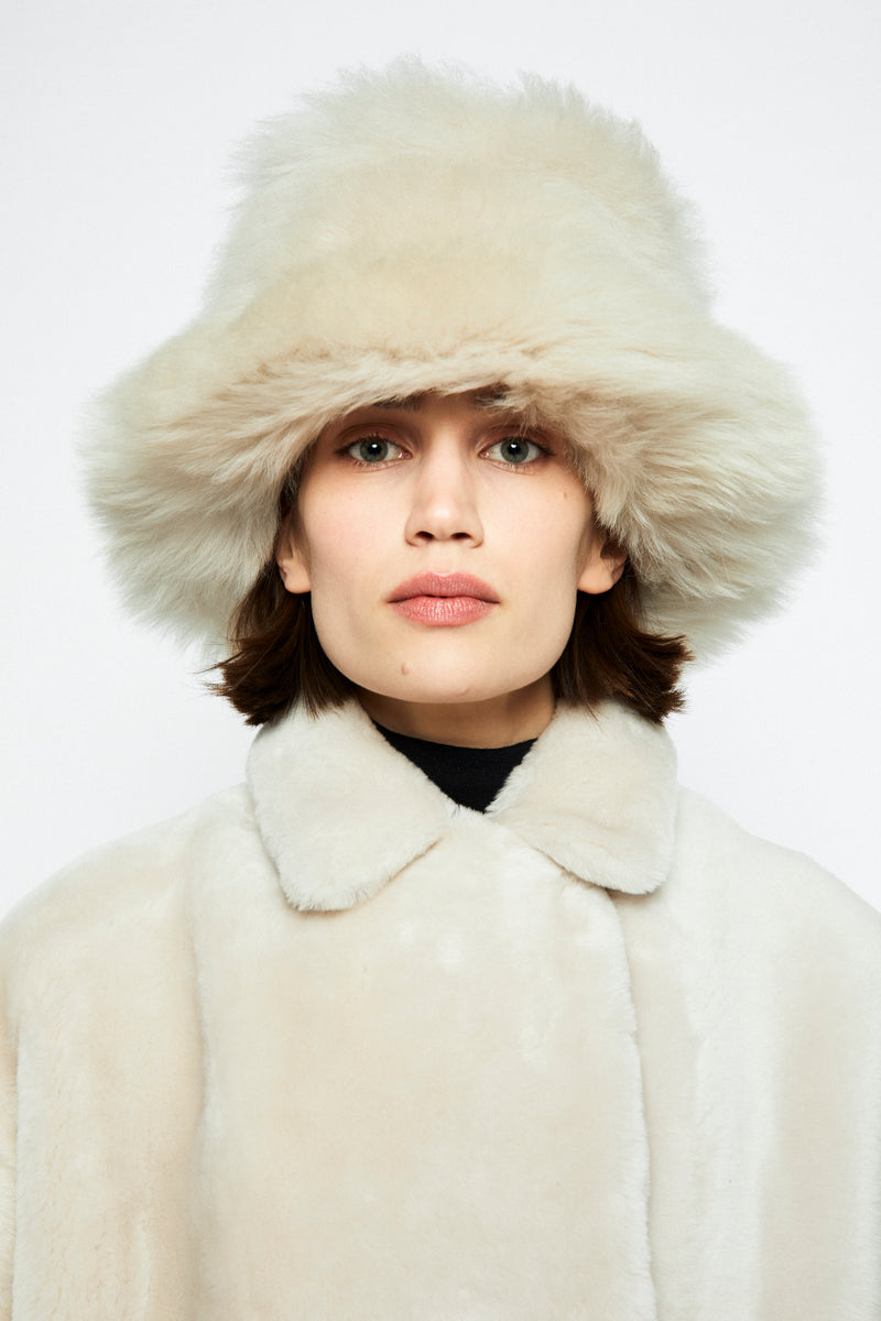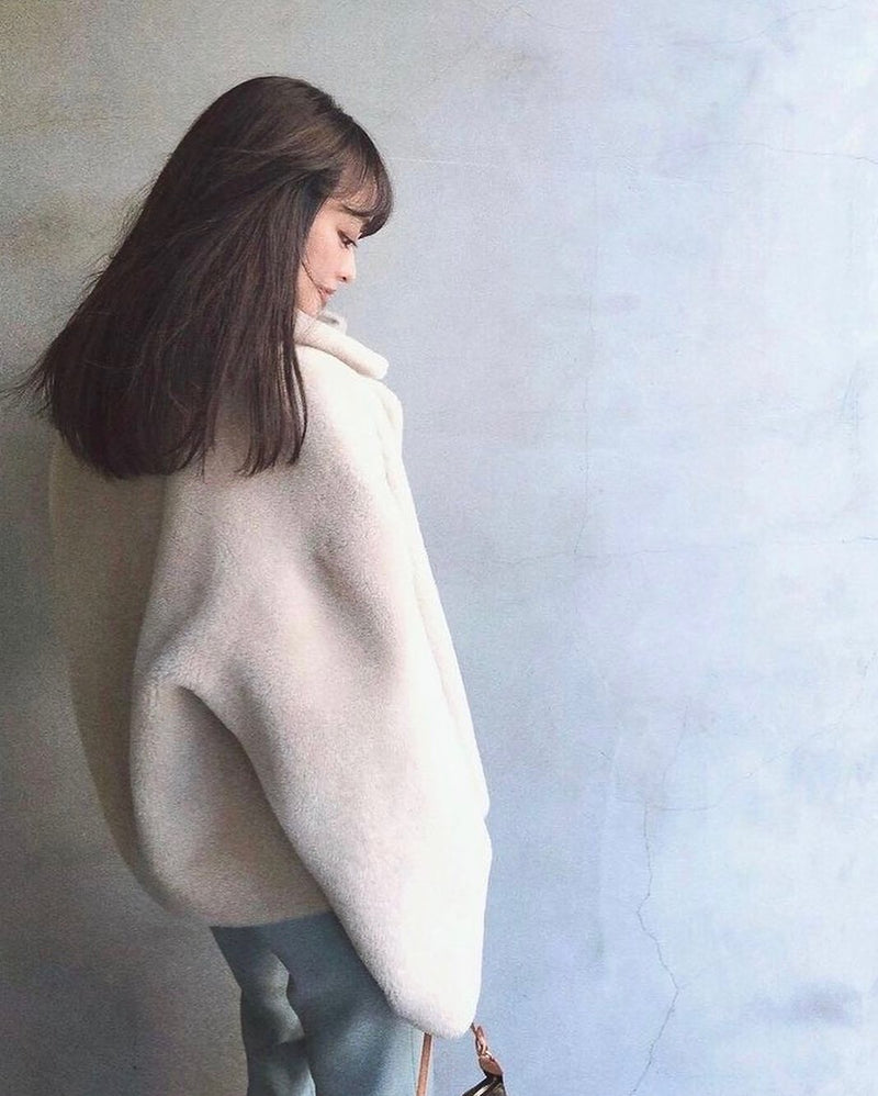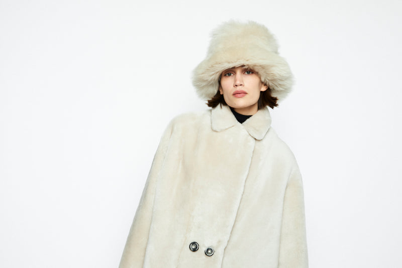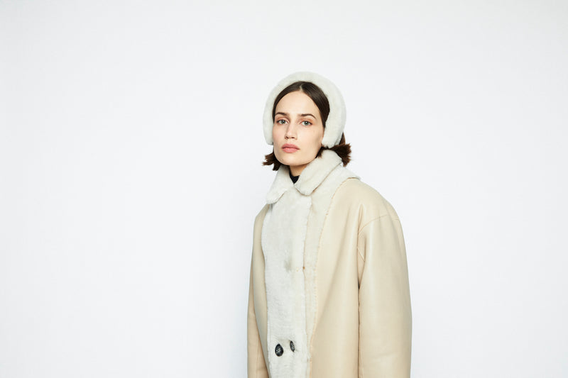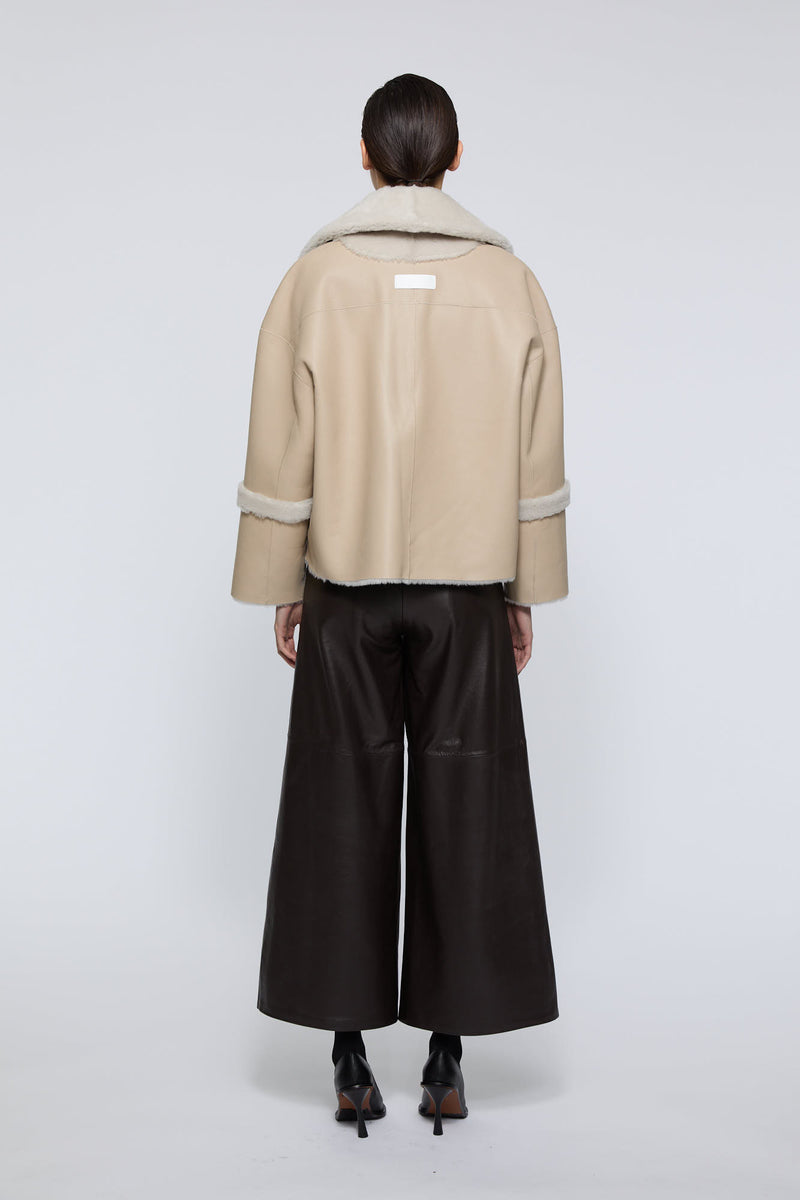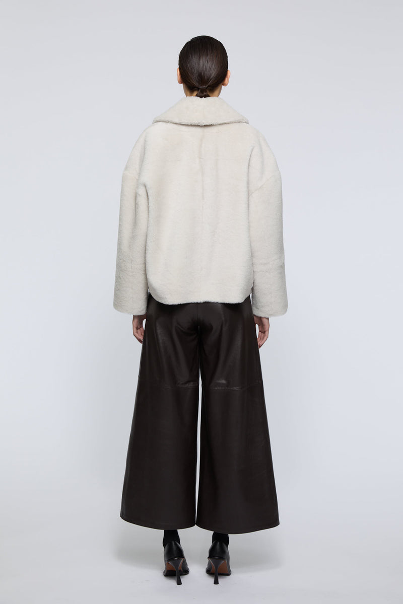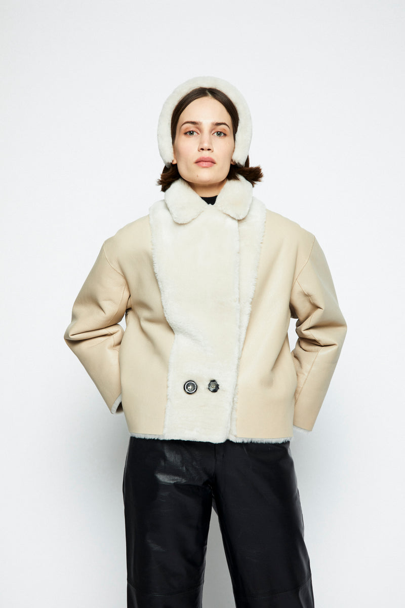 Onar Studios' bestseller Yuki jacket is a cropped reversible jacket handcrafted by our craftsmanship masters of premium ivory merino lamb shearling and is cut for a loose fit. Alternate between the slightly glossed leather and smooth shearling sides. A front button fastening with two side pockets. Yuki will make a stunning addition to your everyday wardrobe rotation. Wear it with everything from tailored pants to slinky midi dresses.