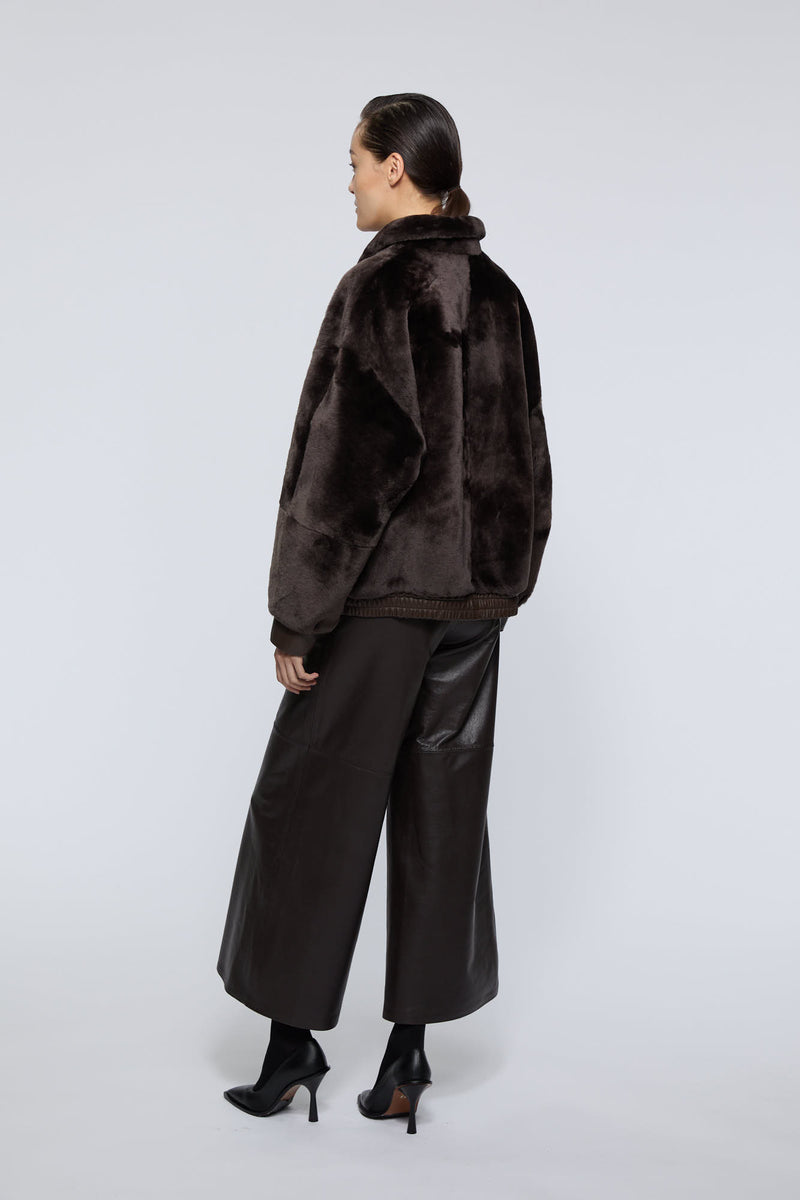 Size GuideFlorence bomber is crafted from premium merino shearling and cut for a relaxed fit. Designed with a classic pointed collar and a concealed front zip closure, it offers a refined balance of structure and ease.