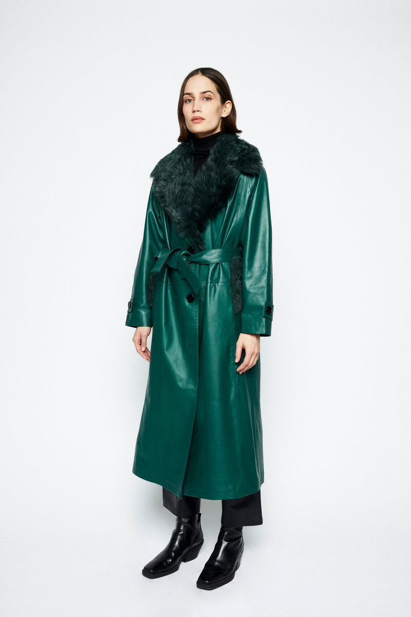 Two coats in one: detachable shearling collar on a lamb nappa leather trench