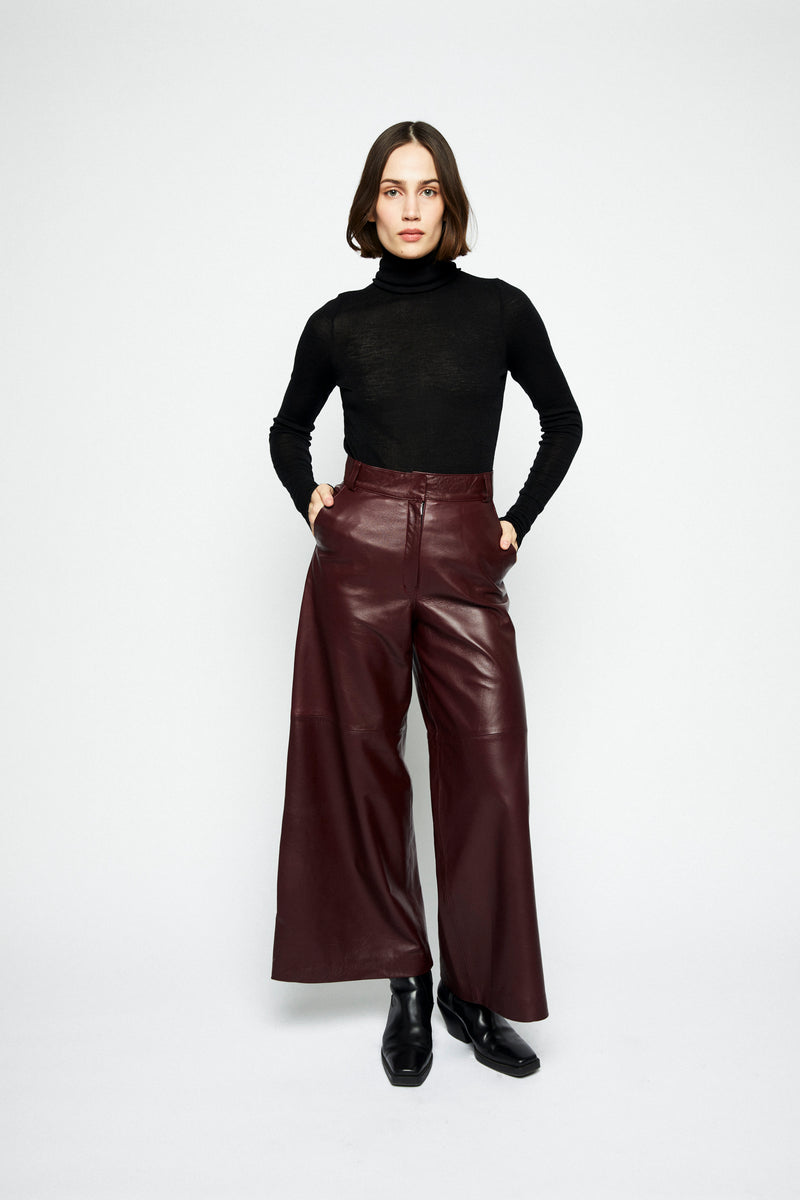 Size GuideHandmade of ecologically sourced premium lamb nappa leather, Sugarhill Pants are universally flattering. They are designed to sit high on the waist and feature a discreet elastic waistband at the back, ensuring a perfect, comfortable fit while maintaining a clean front profile. The wide‑leg silhouette hits just above the ankle, creating a refined sense of proportion.Playing with volume and movement, the Sugarhill Pants are lined with viscose until the knee for ease and comfort. Concealed hook and zip fastening at front. Wear yours with a tucked-in blouse and highlight the cropped length with heeled sandals or boots. The wide legs are slightly cropped, which makes them perfect for spotlighting sculptural mules and ankle boots too.