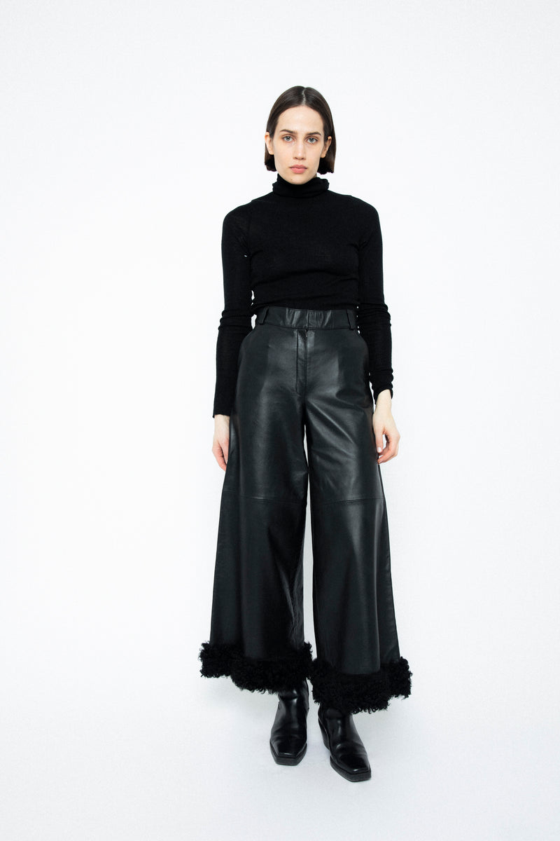環境に配慮した最高級ラムナッパレザーで手作りされた Dora パンツは、どんな人にも似合うパンツです。ウエストの位置が高く、足首のすぐ上まで届くワイドレッグシルエットです。バランスにこだわった Dora パンツは、膝までビスコースの裏地が付いており、快適に着用できます。フロントには隠しフックとジッパーが付いています。ブラウスをインして着用し、ヒールサンダルやブーツでクロップ丈を強調しましょう。ワイドレッグは少しクロップ丈なので、彫刻的なミュールやアンクルブーツを合わせるのにも最適です。