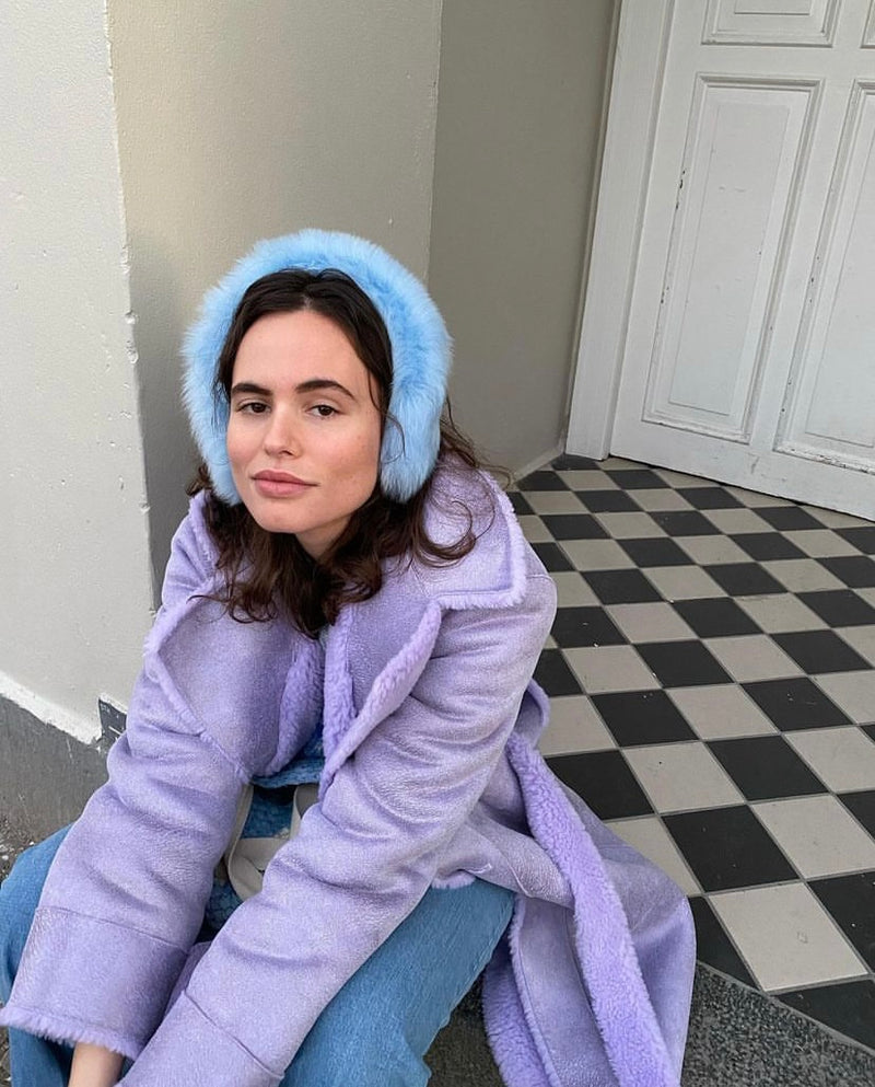 イタリア産トスカーナ産ララバイブルーのシアリングを使用したマグダのヘッドバンド。冬の装いのアクセントとして身に着けてください。