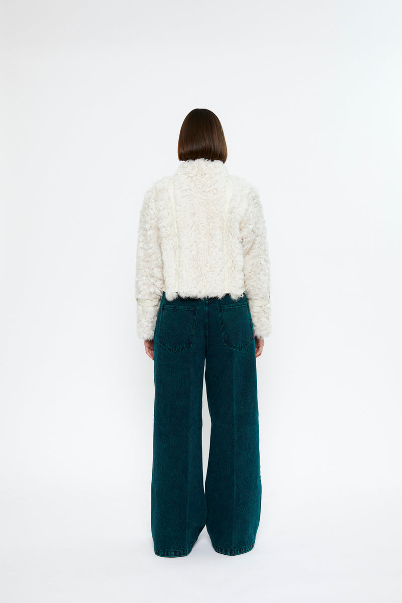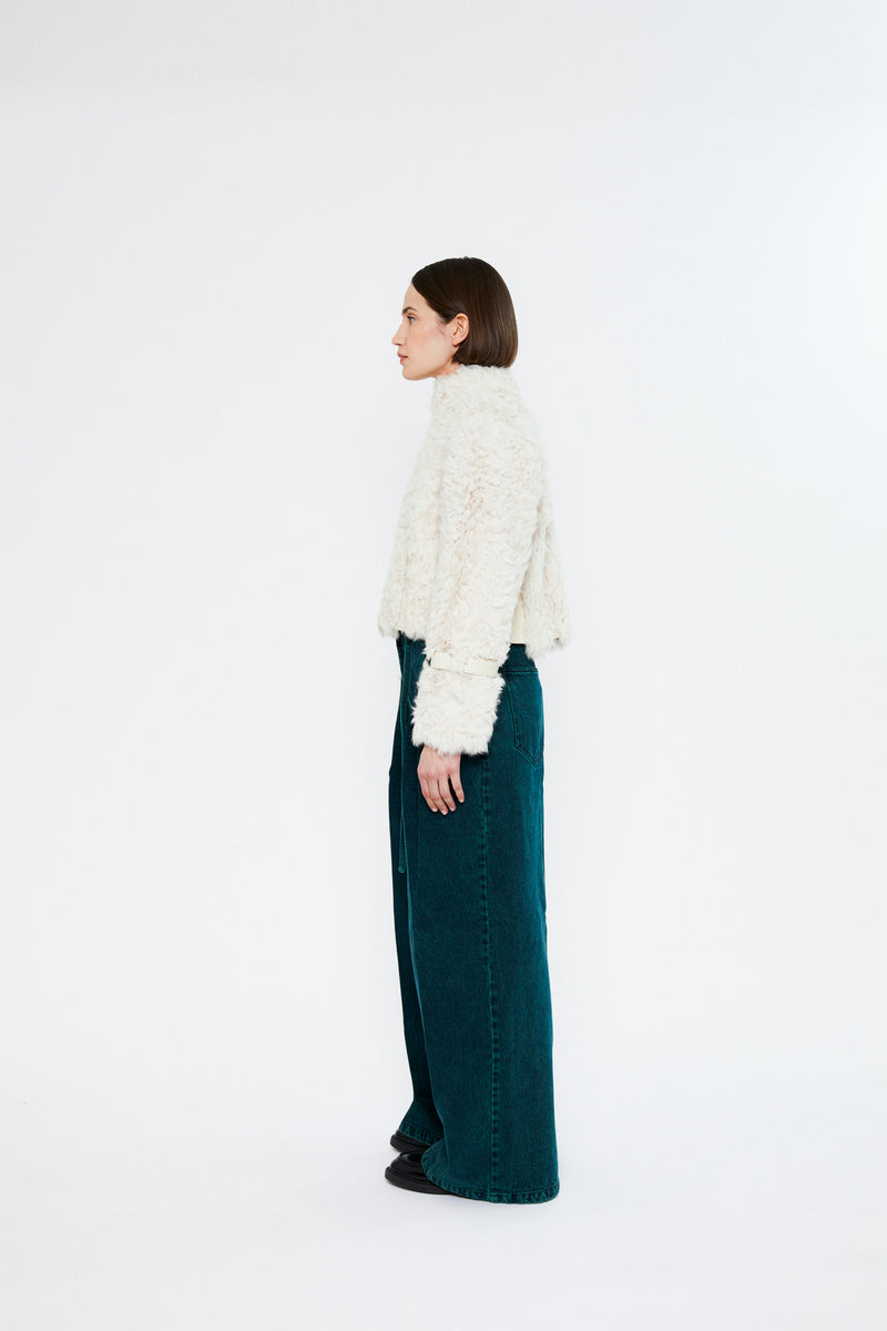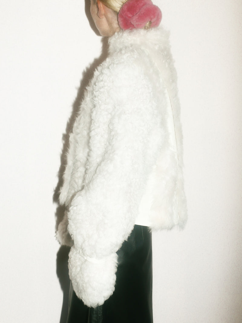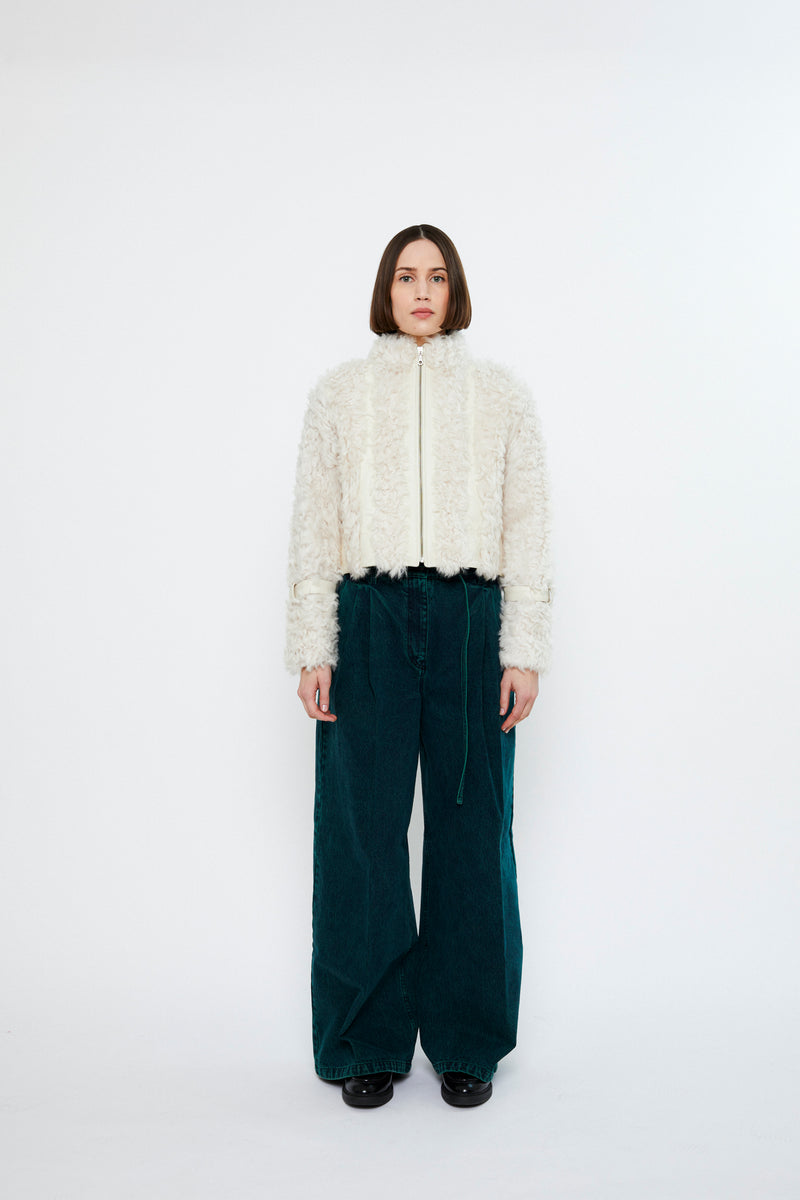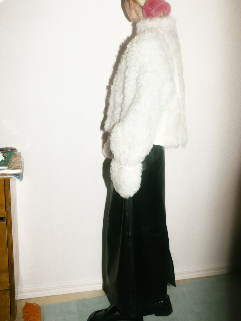 Naomi is a curly 100% ecological lamb shearling jacket with a boxy, cropped fit and a nappa leather detailing on the front and sides. The jacket has side seam pockets and zipper fastening.